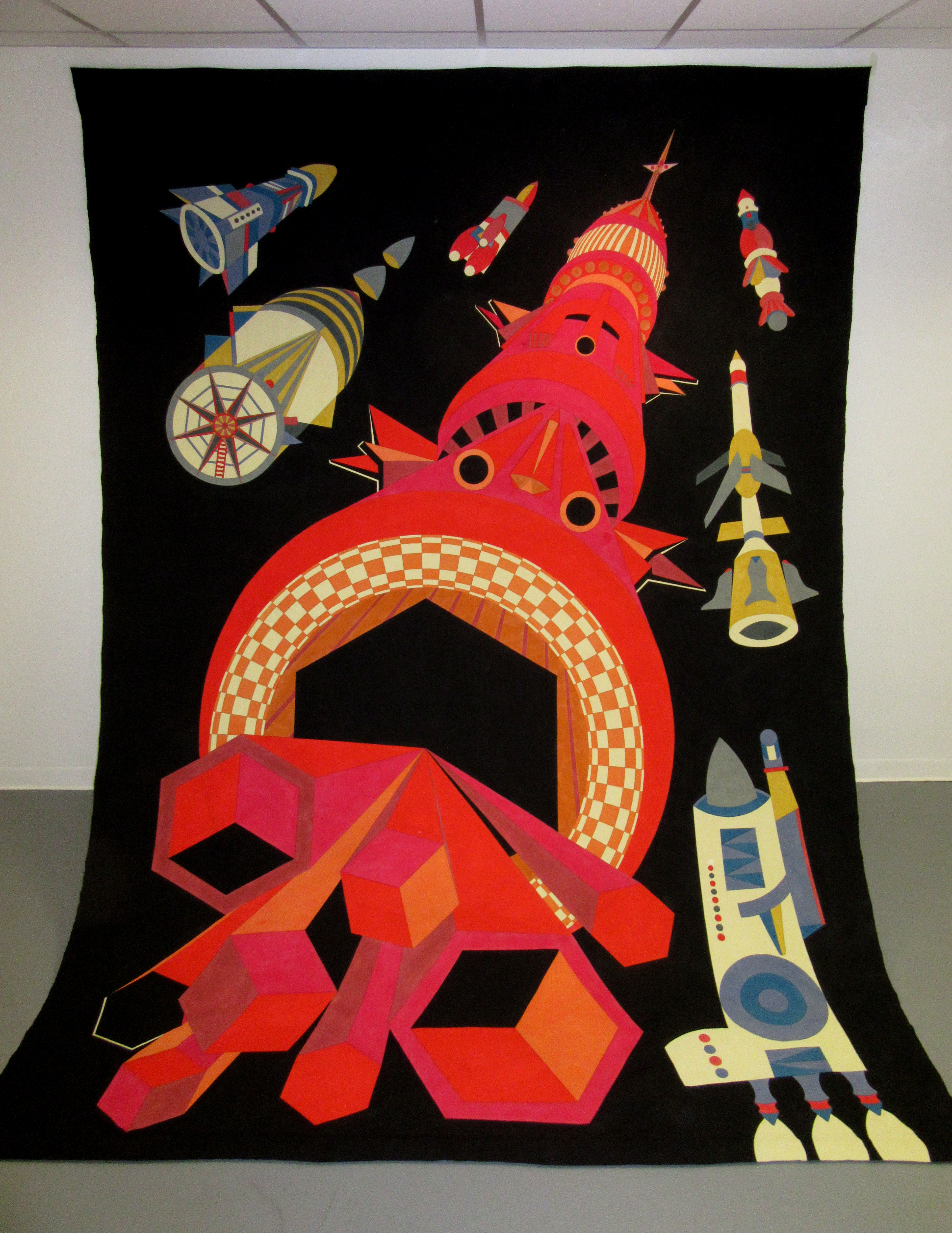 Helen has also exhibited at venues including Ely Cathedral – where she showed The Human Spaceship to celebrate the 50th anniversary of the first Moon landings. This combination of paintings and dresses used bold geometric patterns and high visibility fabrics that allowed pieces to change their appearance when photographed with flash.