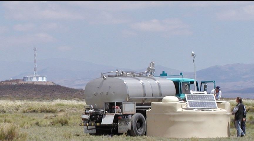 One of the Water-Cherenkov detectors of the Auger Observatory being filled. In the background (left) is one of the buildings that houses six of the telescopes used to detect fluorescence radiation produced as the shower particles cross the atmosphere. Signals from the detector are sent to the mast at the fluorescence station and are then transmitted over a microwave link to a computer at the central station. The Andes can be seen in the distance.