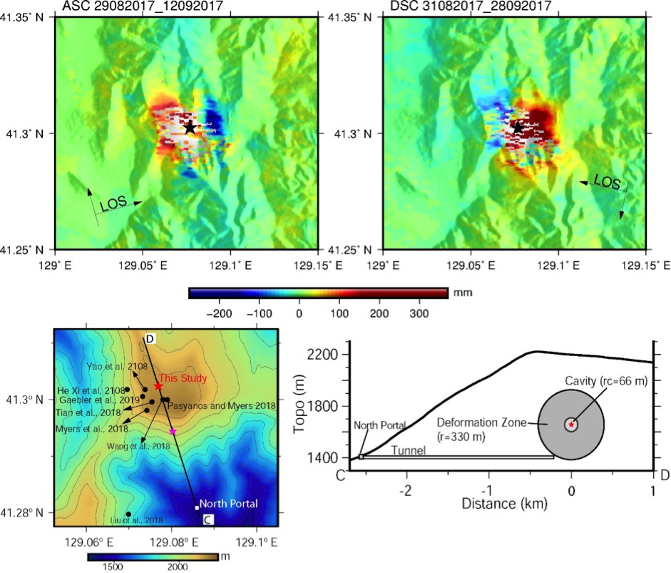 (Top) InSAR data in ascending and descending orbits depicting surface deformation associated with the 2017 nuclear test. (Bottom) Comparison of the source location of the 2017 nuclear test estimated from this study (red star) with other estimations. Topography along profile CD showing the cavity, deformation zone and probable location of tunnel. Note that the sizes of the cavity and deformation zones are exaggerated by 5 times for better visualisation.
