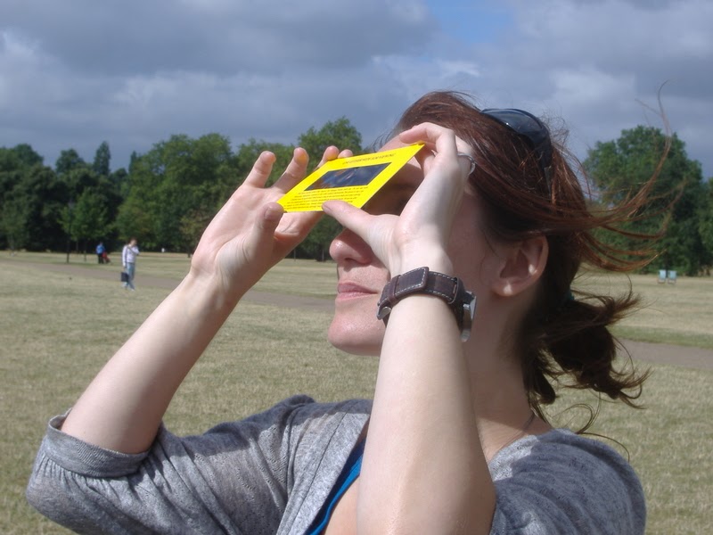 A woman using eclipse shades, certified to safety standards, to view a solar eclipse.