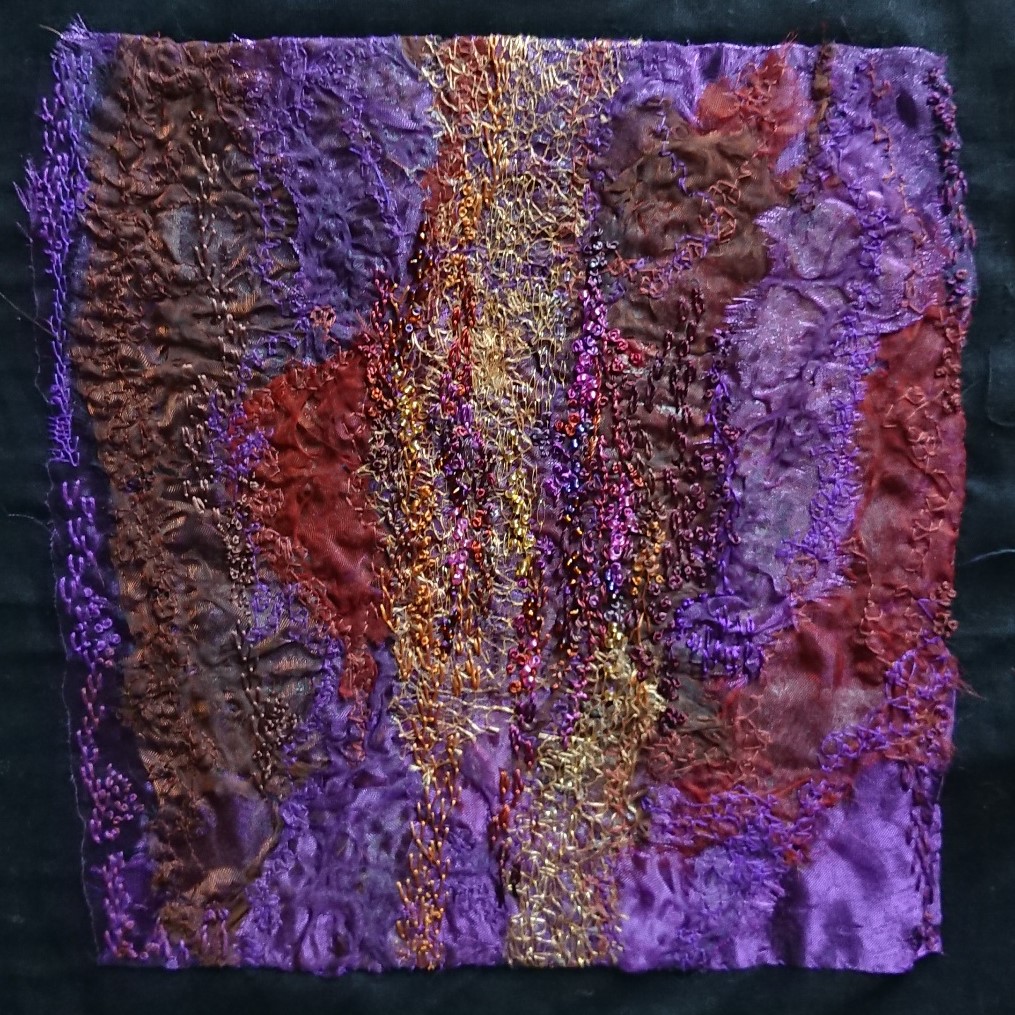 "I distorted different coloured voiles with a heat gun to get texture and variations in tone. I then bonded them together with Bondaweb. Next I used free machine embroidery, hand stitching and some beads. I was trying to show the rich colours and textures seen in the Hubble images of the Carina Nebula."