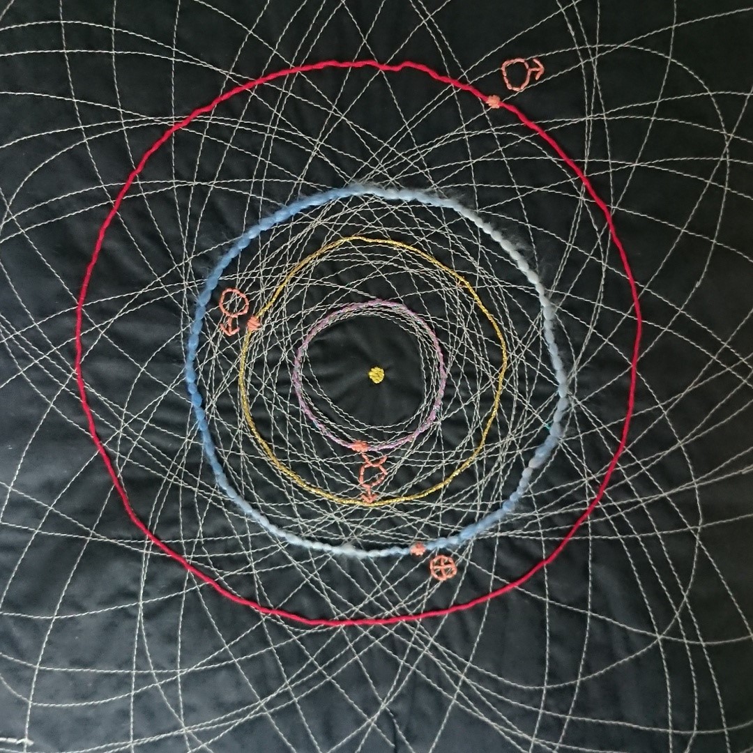 Techniques used: Machine embroidered asteroid ellipses. Various embroidery stitches including couching for the planet orbits and the symbols for the 4 inner planets