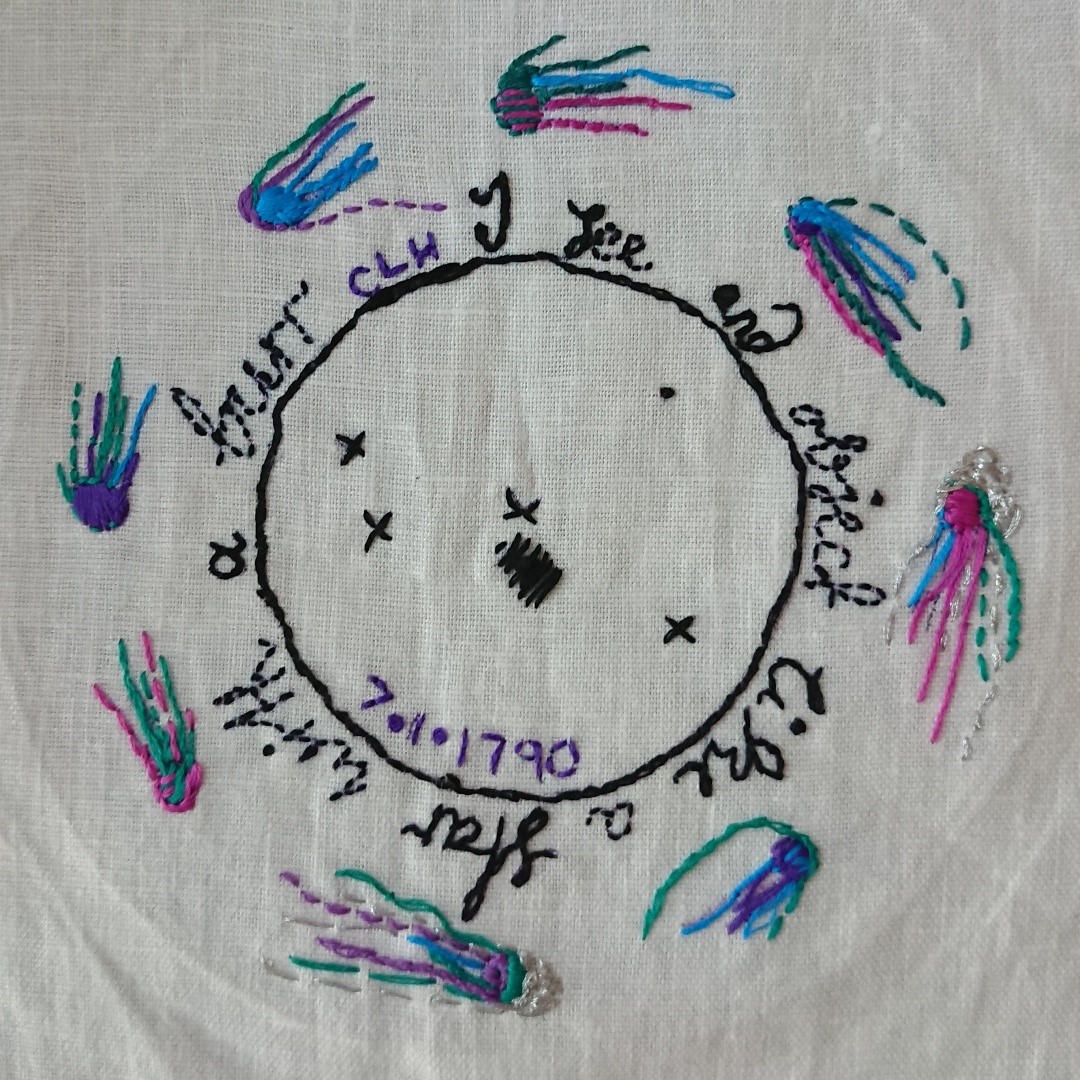 A piece from Caroline Herschel’s notebooks that we have in the RAS library where she observed a comet. I wanted to capture the observation and her beautiful handwriting. The piece from the notebook is surrounded by 8 (rainbow) comets, because Caroline observed 8 comets.