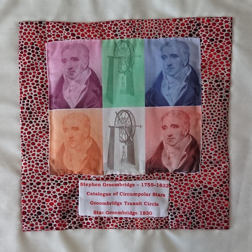 "Our Daughter Annabelle remarked our family name was on a Star map she was using for her research, looking more closely we discovered there were indeed Stars with the name Groombridge next to them. This has started a curious chain of events to trace if he was a member of our family and to discover more about him. This in turn lead us to RAS, as he was one of the founders and that's where we found out about the quilt project. We thought it would be fitting to bring him 'home' to RAS and to remind people who he was and what his ground braking achievements were at the time. It has started us off on a fascinating journey of discovery & learning, all because of a Star.