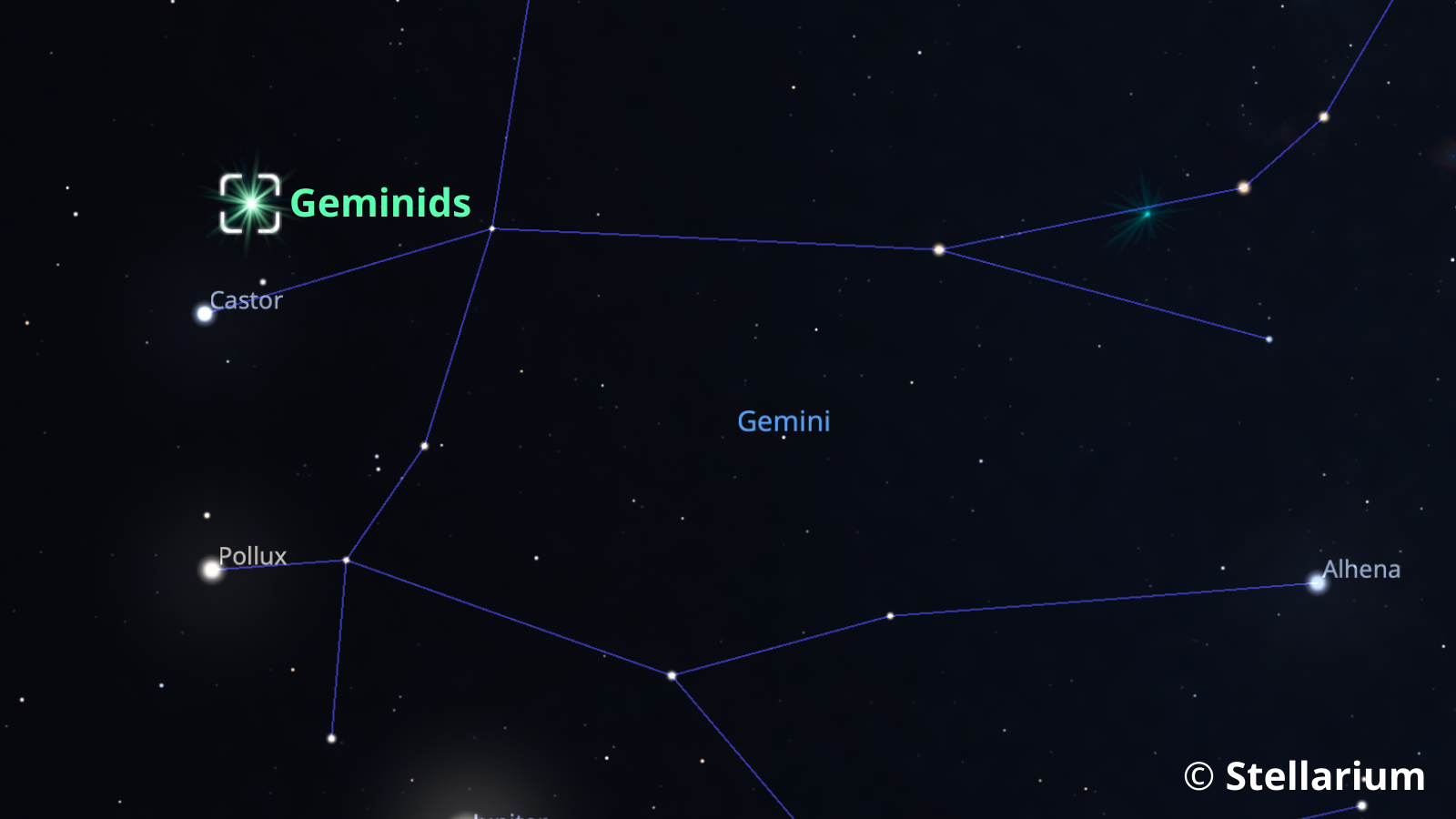 Meteors in the upcoming shower can appear anywhere in the sky, but their trails appear to originate from a single point (known as the radiant) in the constellation of Gemini, hence the name Geminids. These meteors appear to be fairly slow moving, and can be intensely coloured.
