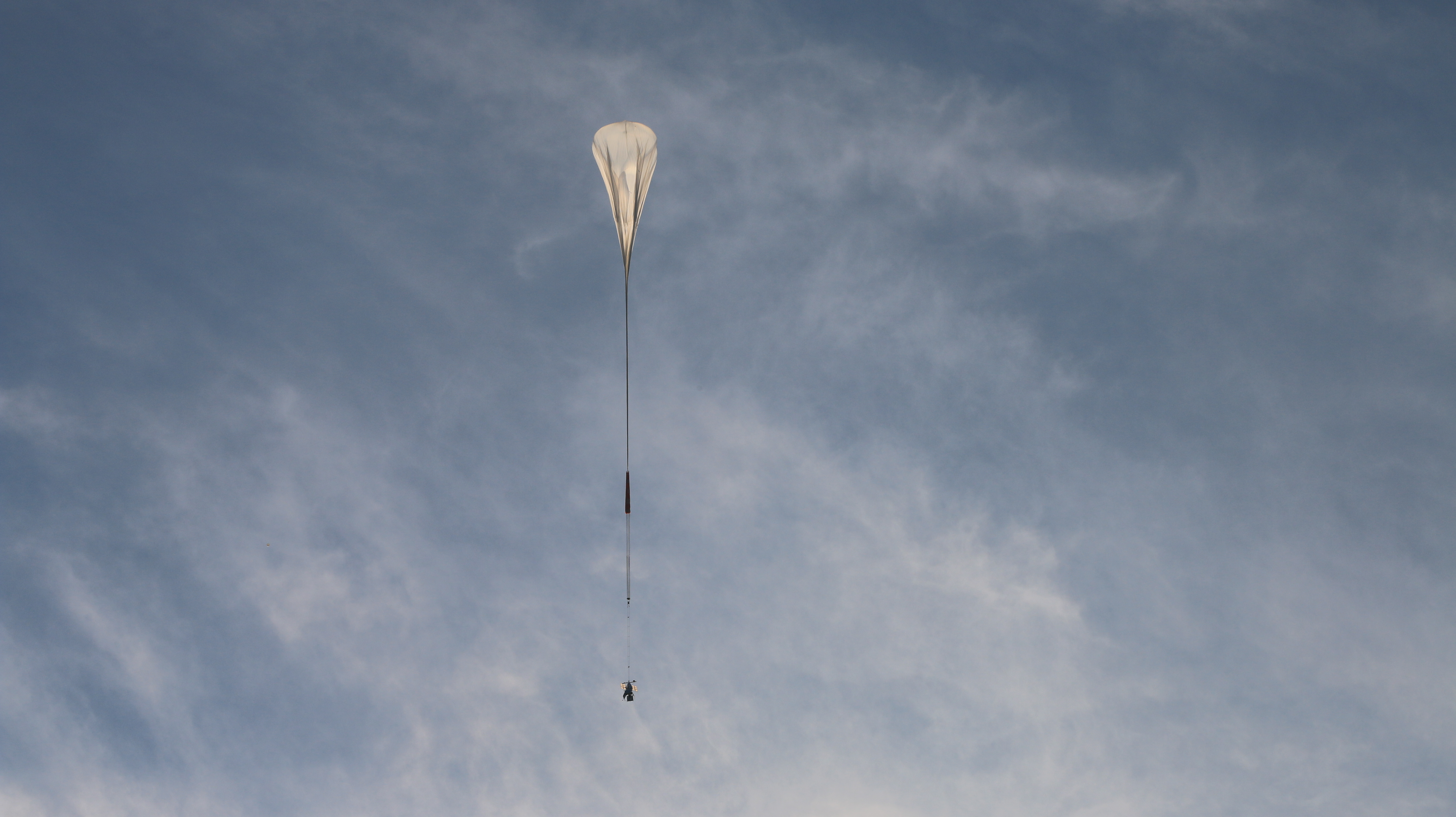 The SuperBIT balloon in flight, above NASA’s Columbia Scientific Balloon Facility, Texas, in June 2016. Credit: Richard Massey (Durham University).