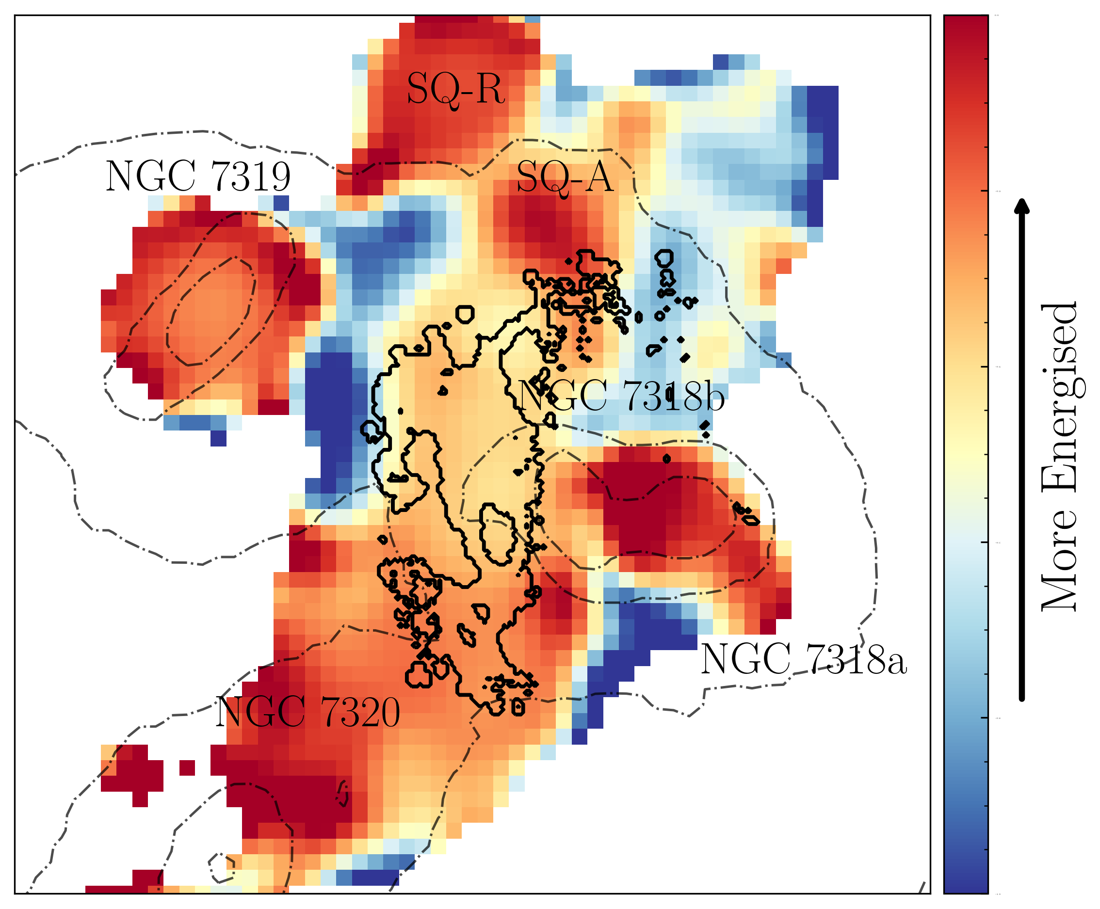 Caption: WEAVE decomposition of gas in Stephan's Quintet, overlaid on a JWST image. The red highlights gas shocked by the collision, while green and blue shows star-forming regions. The purple areas represent bubbles with an unknown origin. The black contours show neutral Hydrogen, and its location relative to the shocked gas (in red) suggests that is where it comes from.