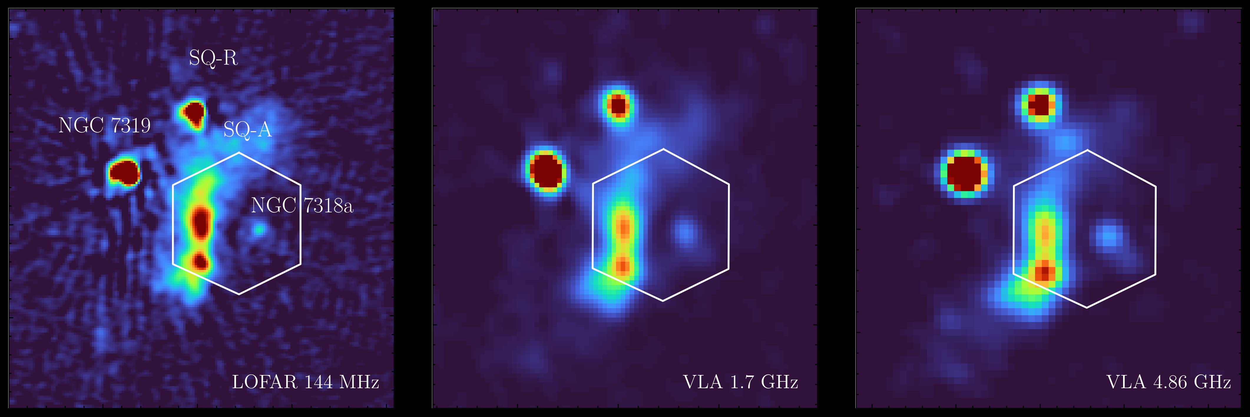 Caption: Radio observations of Stephan's Quintet at different frequencies, taken by the Low Frequency Array (LOFAR) and the Very Large Array (VLA). The red colours indicate strong radio emission coming from the shock front, as well as from some of the galaxies in the group and beyond.