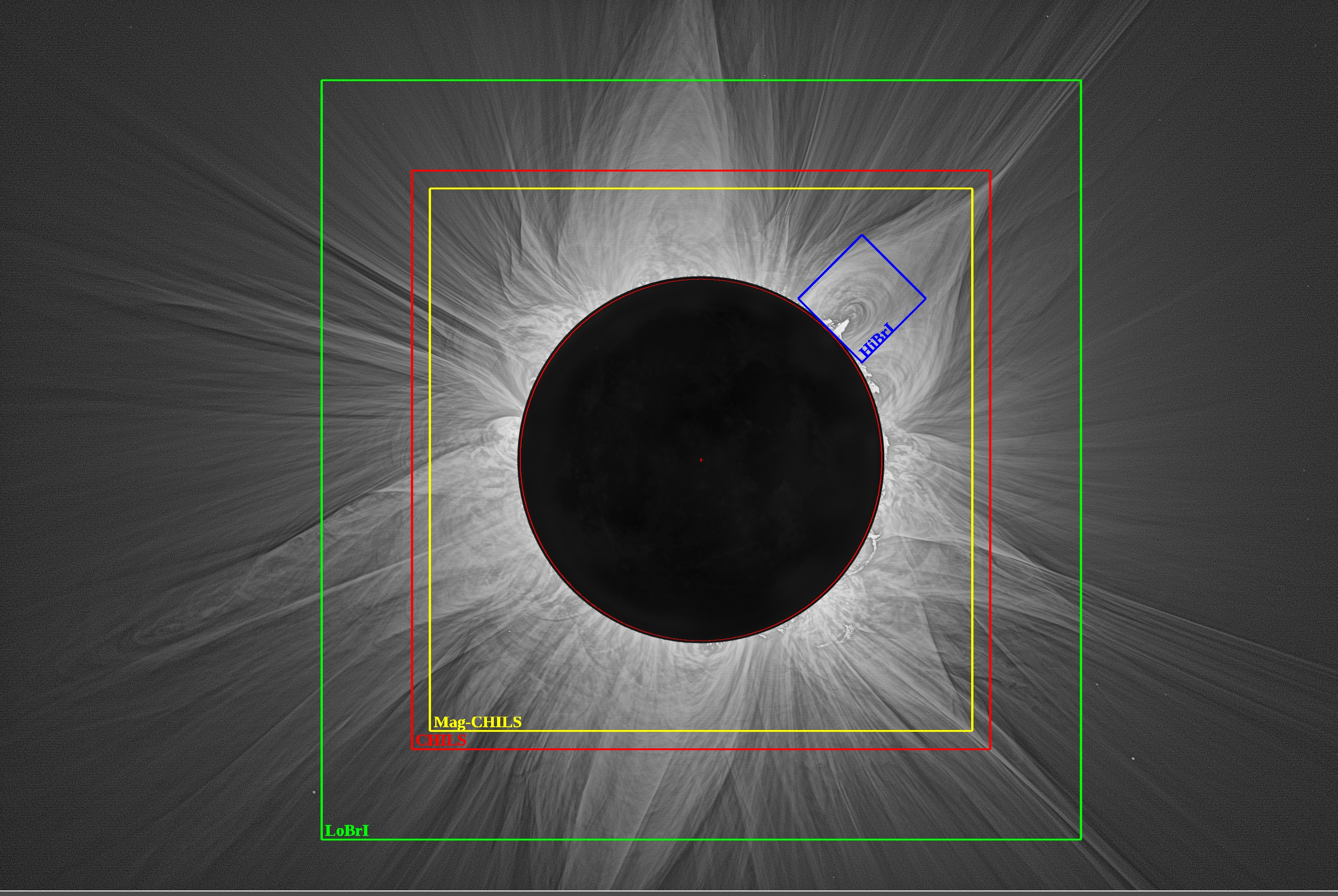 Caption: The same total solar eclipse with the fields of view of the MESOM instruments superimposed on top of it (i.e. HiBri,LoBri, CHILS and Mag-CHILS).