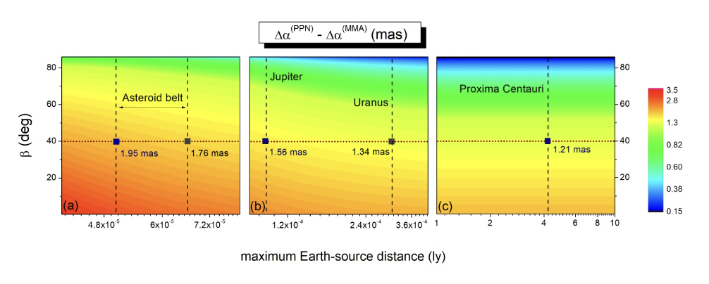 Caption:Contour plot showing the differences between the new equation for the GBL angle and previous approximate equations. It is assumed that the main reflector is the Sun. Non-negligible discrepancies (in reddish shades) are found for Asteroid belt bodies (left panel), leading to a plausible delocalisation of such minor objects. On the other hand, significant deviations are also reported for Proxima Centauri (right panel), in comparison with the angular size of this star.