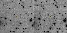 Images of 2015 BZ509 obtained at the Large Binocular Telescope Observatory (LBTO) that established its retrograde co-orbital nature. The bright stars and the asteroid (circled in yellow) appear black and the sky white in this negative image.