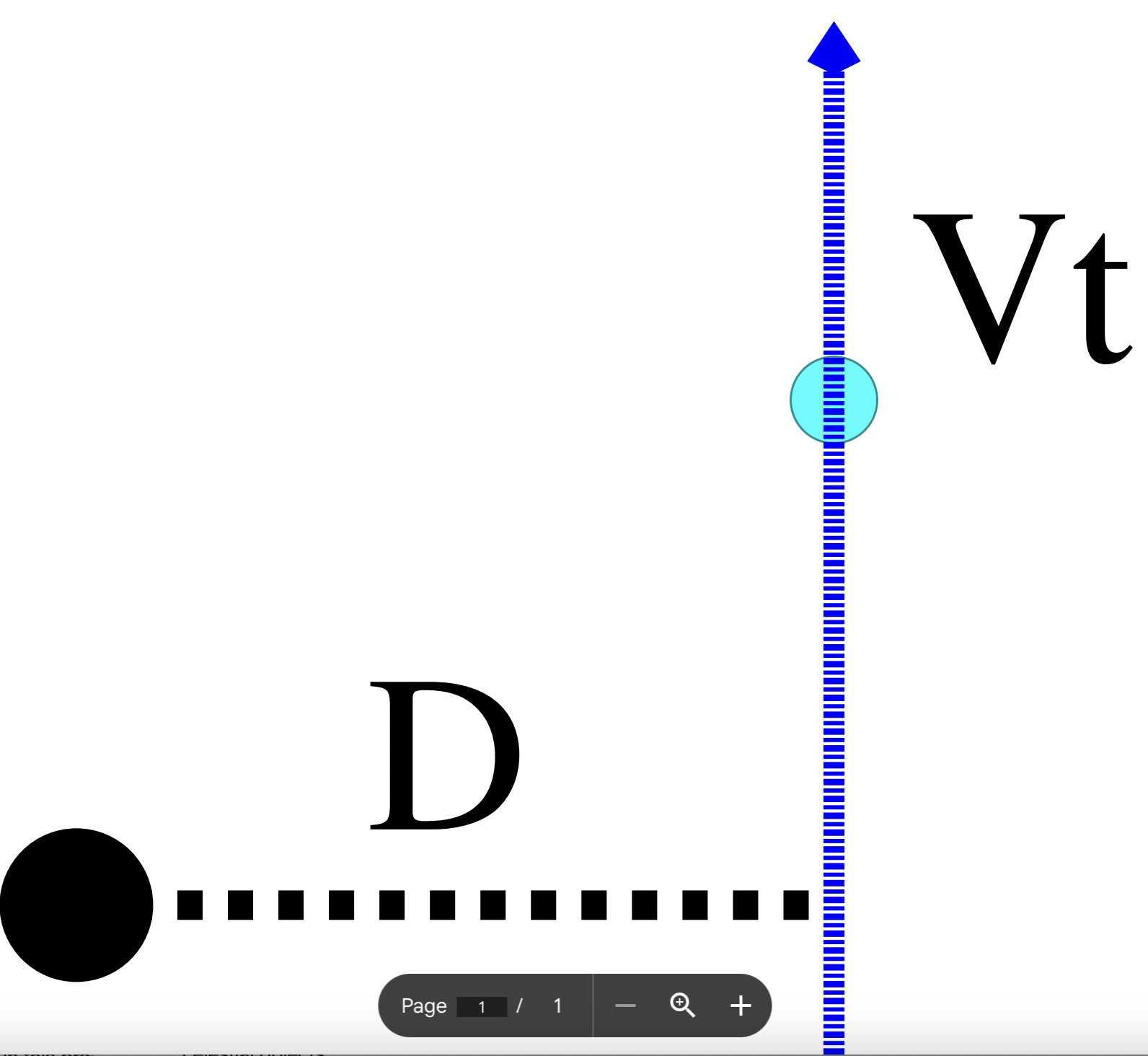 Caption: Graph showing the time-dependent geometry of a pulsar. Dark matter cosine as viewed by the observer. The Z axis goes from the observer to the pulsar (dot on the left). The point of closest approach is a distance D along the X axis. The Y coordinate is upward along the projected speed of the mass concentration. The displacement along Y is taken as V t. The mass concentration is in the plane at (D,Vt).