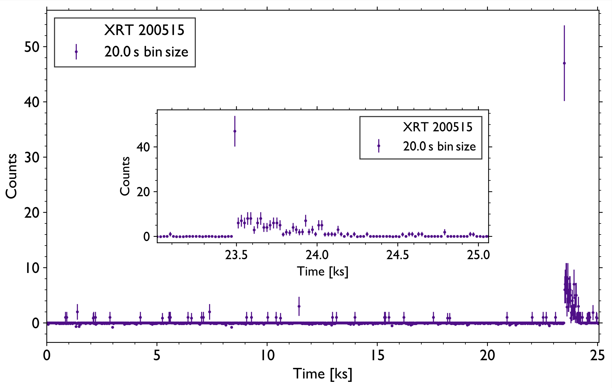 Caption: An image of the lightcurve (amount of photons received from the burst location over time) of XRT 200515, which shows how strong and fast the burst is.