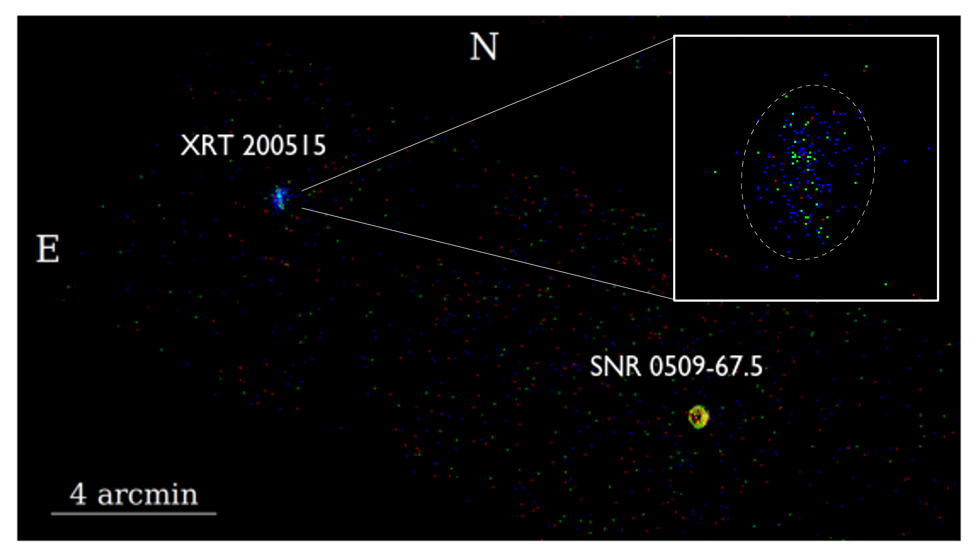 Caption: The field of view Chandra was observing when XRT 200515 occurred. The XRT 200515 label in yellow points to the burst and shows that it is only 10 seconds long.