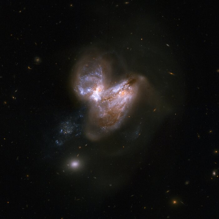 Similar types of objects have been found in the more local, present-day Universe, such as Arp 299 shown here. In this system, two galaxies are crashing together generating an intense starburst as well as heavy obscuration of the growing supermassive black hole in one of the two galaxies.