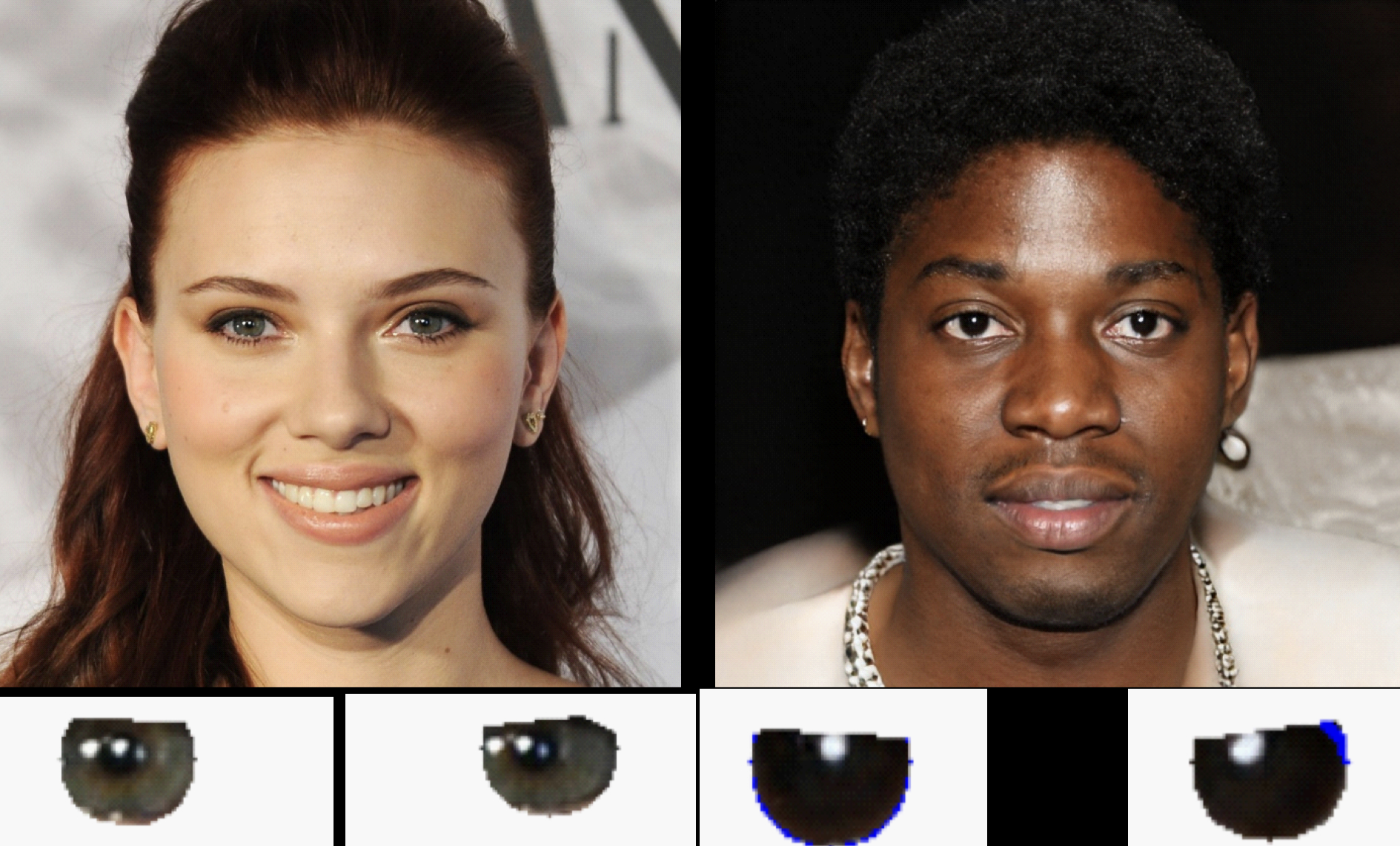 Caption: In this image, the person on the left is real, while the person on the right is AI-generated. Their eyeballs are depicted underneath their faces. The reflections in the eyeballs are consistent for the real person, but incorrect (from a physics point of view) for the fake person.